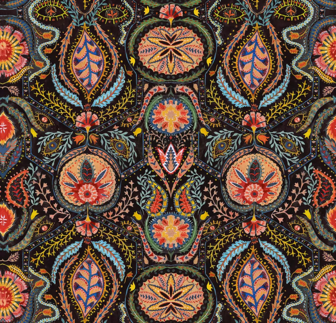 Alluding to the intricacy of the paisley and psychedelic prints of the 60s, SOUL SACRIFICE draws you into an enchanting world of colour and depth. Enticing the eye into the dark background, you get lost amongst the organic forms which entwine across the surface, lighting up the walls like stars in a night sky. Eyes seems to peer at you amongst glowing branches positioned around larger central motifs, watching as you take in the intensity of pattern and colour unfolding before you.