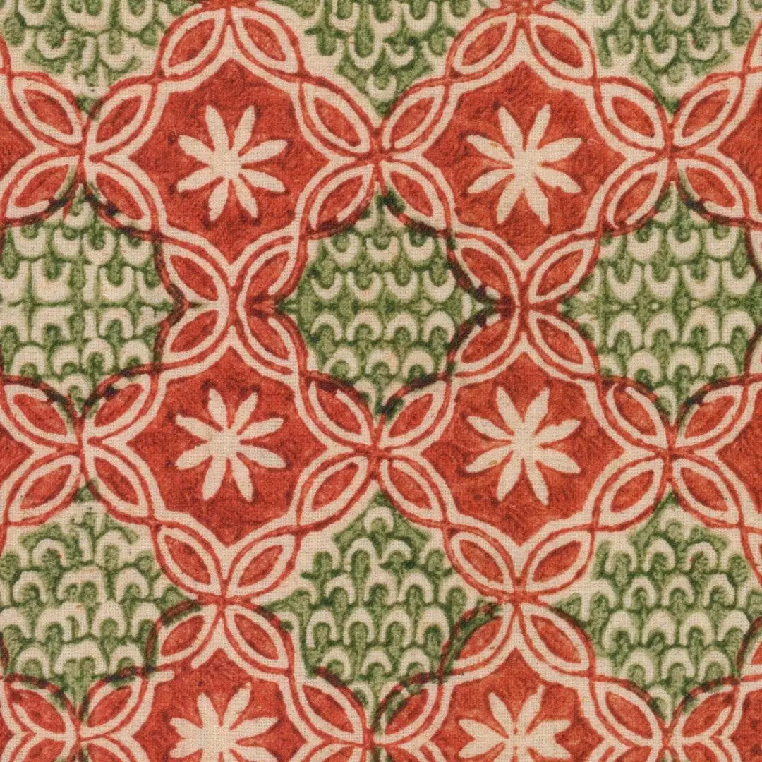 Referencing Indian folk music through its bright colours and intricate patterns, RASIYA brings a playfully elegant touch to the home. The delicate patterns entwine with each other, resembling floral-inspired motifs set against a pastel green backdrop which allows the terracotta red tones to beautifully stand out. Trellis design of red, Green and Taupe.