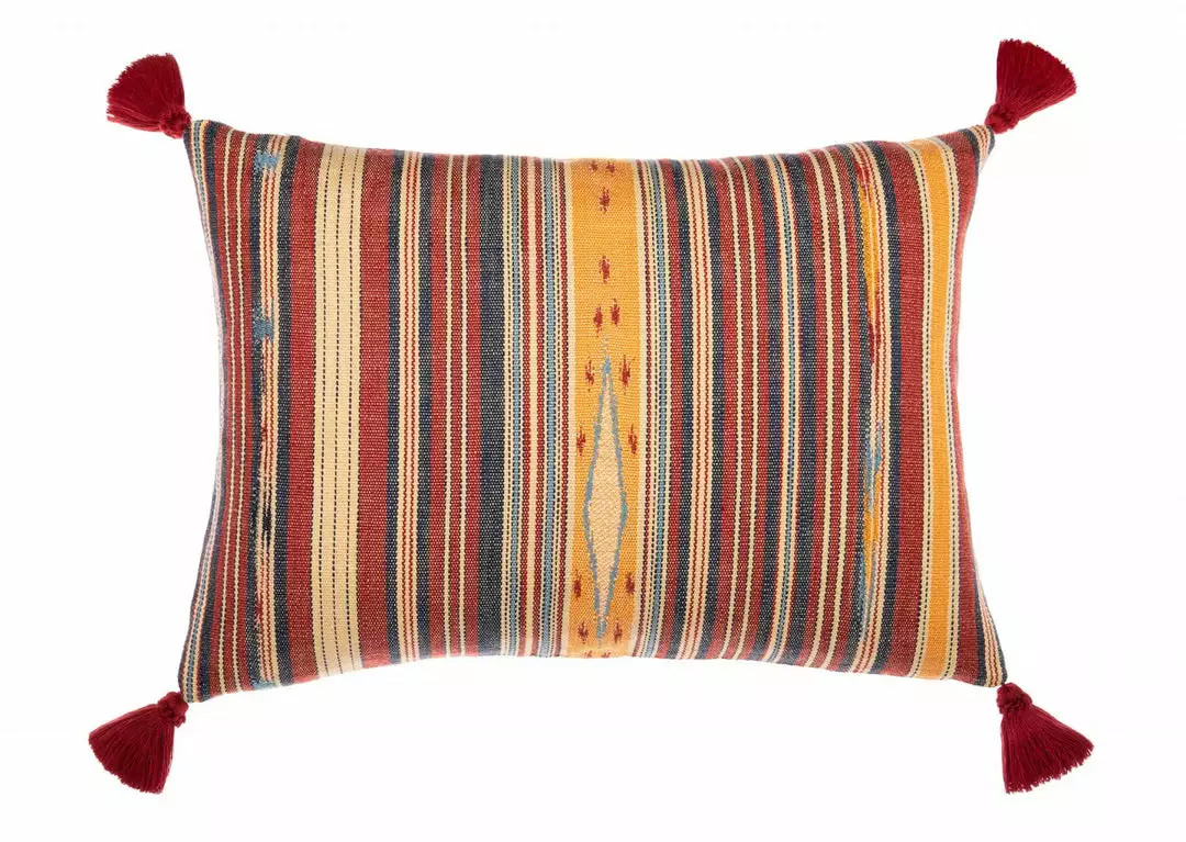 A vibrant and colourful design with varying vertical stripes and a central motif drawing the eye across the assortment of line patterns and hues. NEYSHABOUR embodies the spirit of Woodstock with its rich palette and confident colour combinations while the woven texture adds a soft touch to the design. The four red cotton tassels give the cushion a refined silhouette while the duck feather filling complements it.