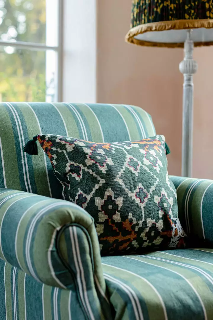 Our distinctive cushions show beautiful patterns and details of our fabrics. Made of heavy linen or cotton pile velvet all cushions are printed in England using traditional methods. Our cushions come with a variety of finishes such as fringes, tassels, pom-poms or printed borders adding little touches of luxury and uniqueness. Linens are stonewashed finished for softness and vintage effect.Â