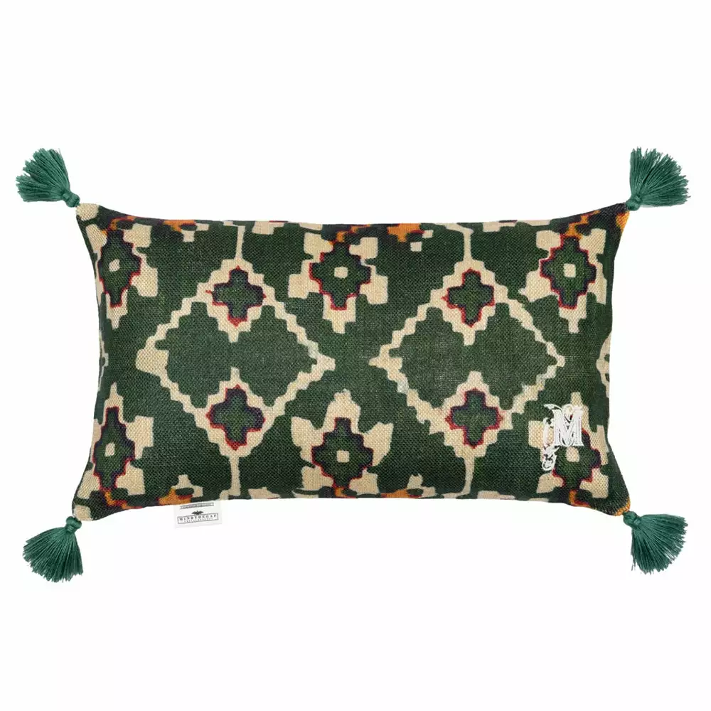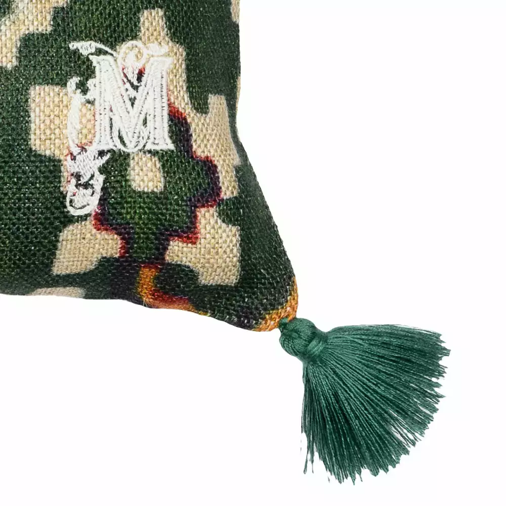 A geometric flowery pattern with eloquent Hungarian colour palette of rich greens and highlights of taupe and orange. Full pattern on both sides and with ‘M’ monogram on the back. Hand finished with green cotton tassels.