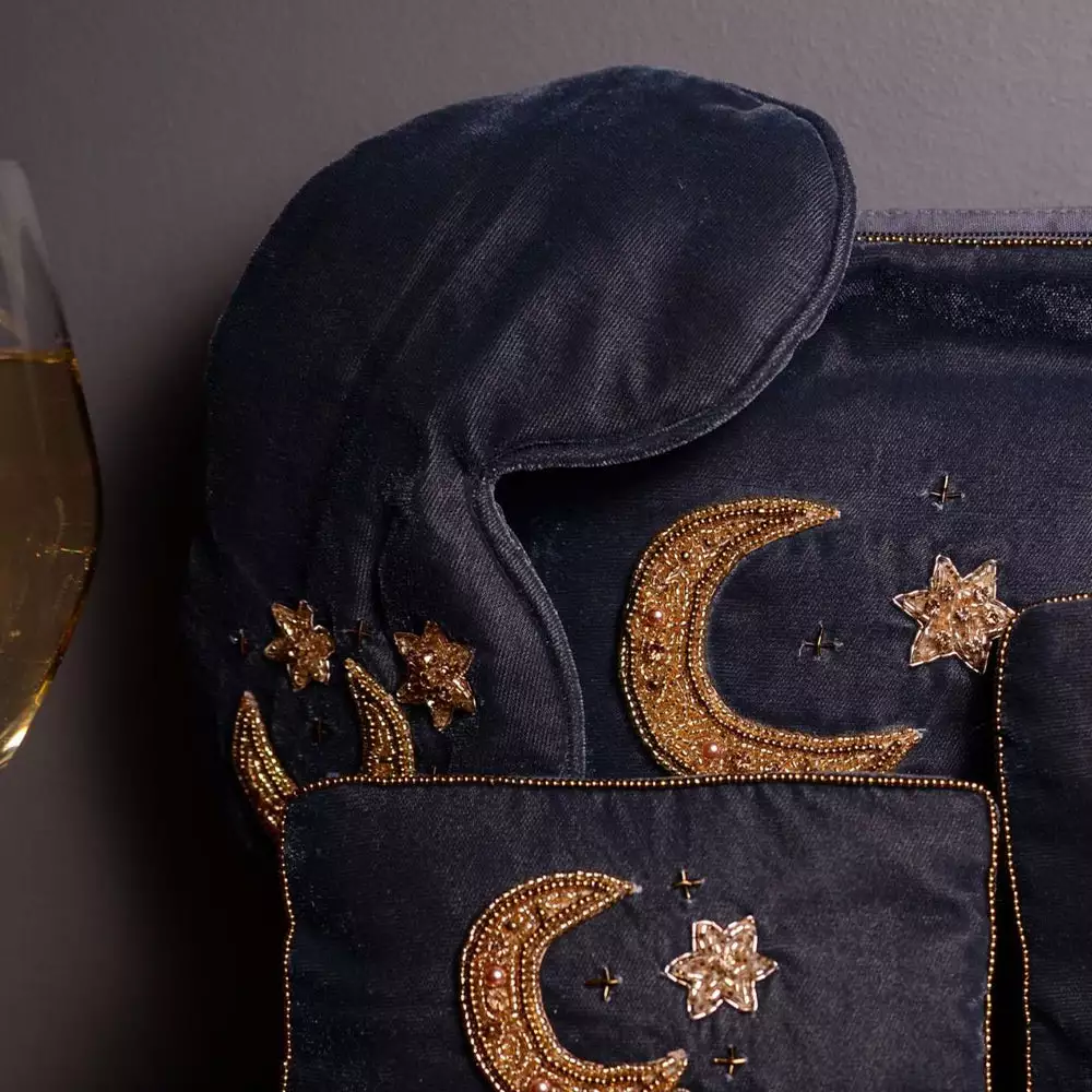 Drift off into space with our gorgeous new embroidered moon & stars luxe velvet eye mask. A gorgeous golden beads and jewels scattered beautifully on a slate grey velvet.