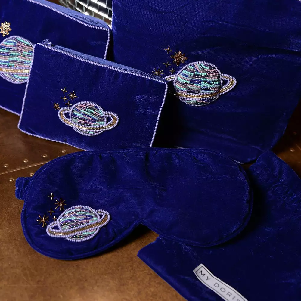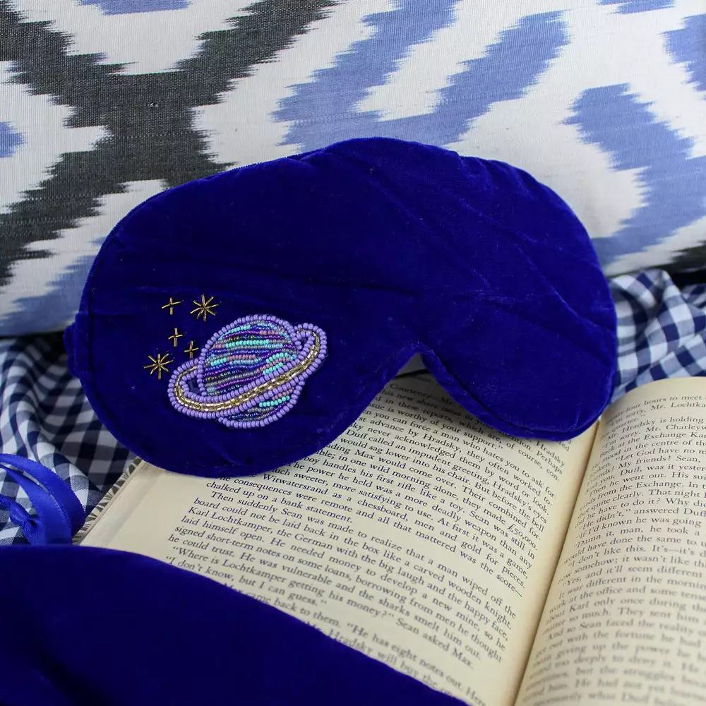 Drift off into space with our gorgeous new embroidered planet luxe velvet eye mask. A gorgeous lilac, blue and purple planet poised beautifully on a midnight blue velvet.