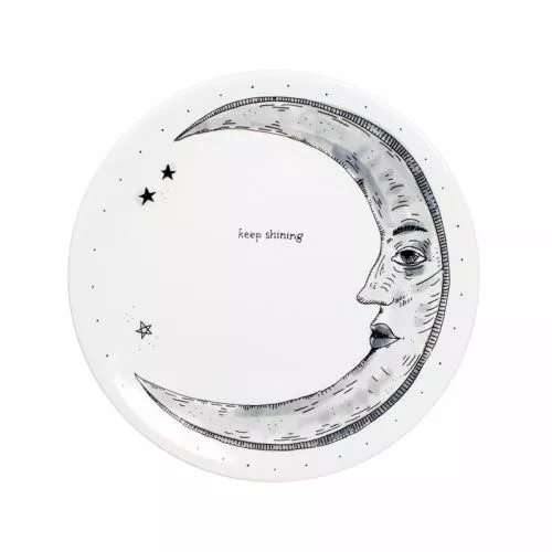 The simplest of items made special. A lovely black and white decorative plate with a crescent moon and ‘keep shining’ message in the center. Glazed, fine stoneware