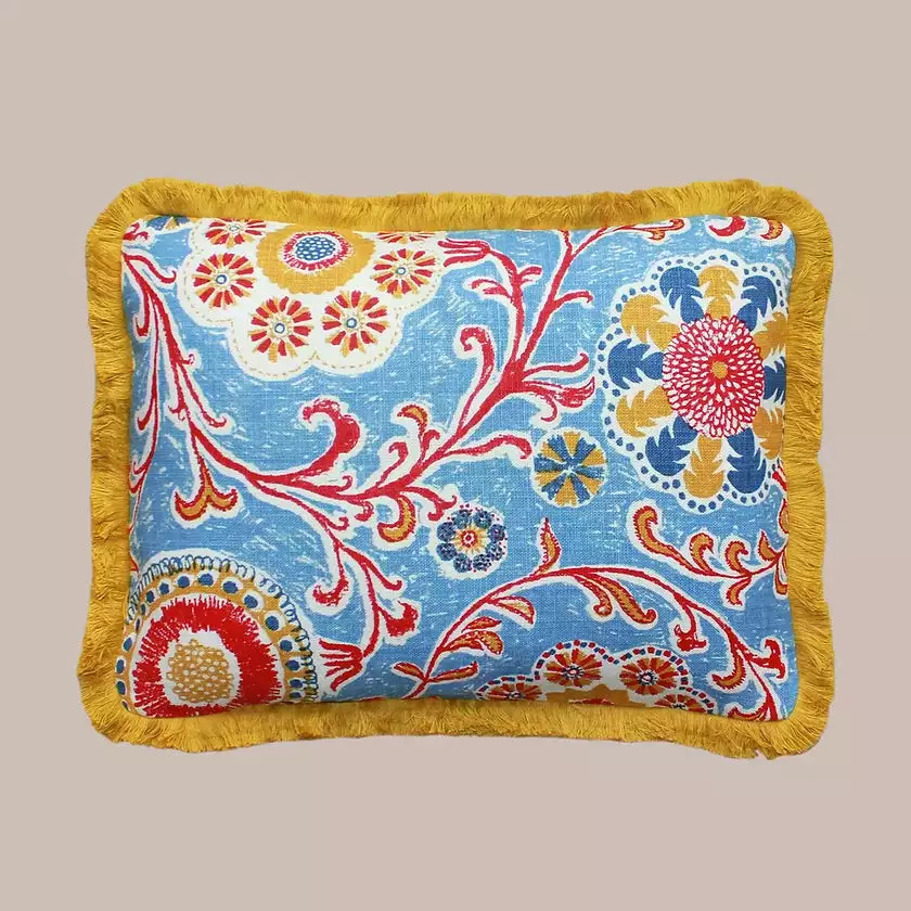Nomad is a playful interpretation of embroidered decorative tribal textiles featuring wild climbing vines with hanging abstract fruits and flowers. The original artwork has been hand drawn by Ellen using oil pastels and pencils and then screen printed to maintain the original texture and character. Completed with a mustard yellow fringe trim and mustard back. It has an invisible zip along the bottom edge and is filled with a plump natural duck feather cushion pad.Â