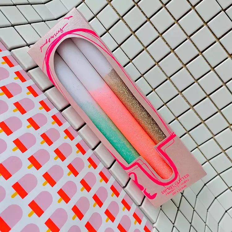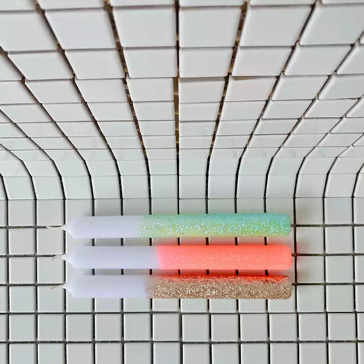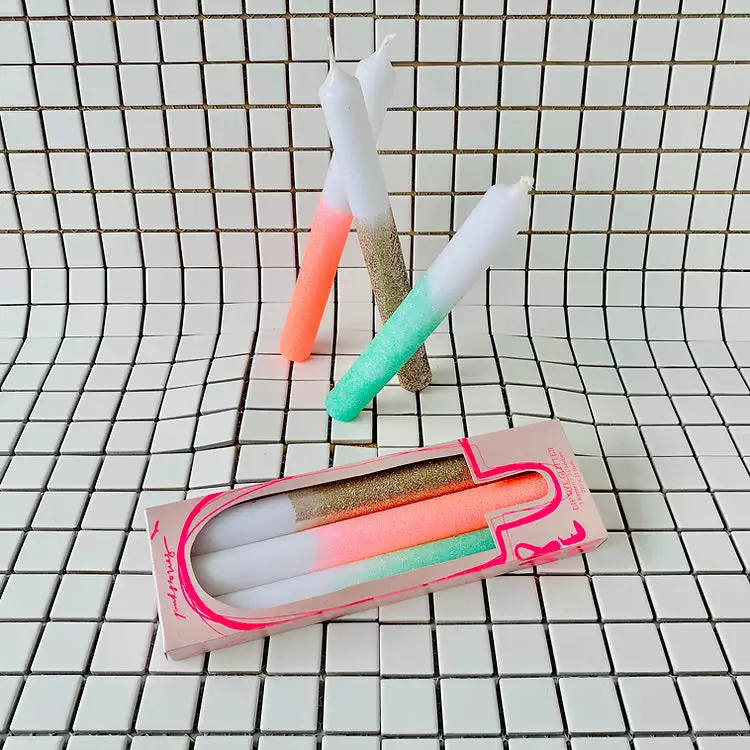 This boxed set of x 3 taper candles will satisfy all your retro day glow dreams. Now with added glitter sparkle for maximum glam. A fun way to brighten up your table setting and a most unique, fun gift item.Â
