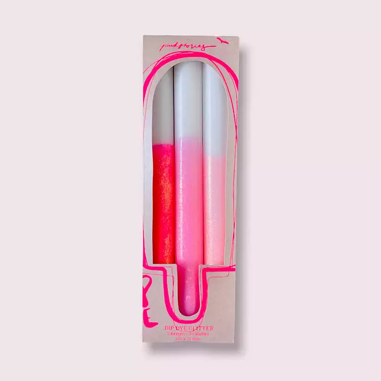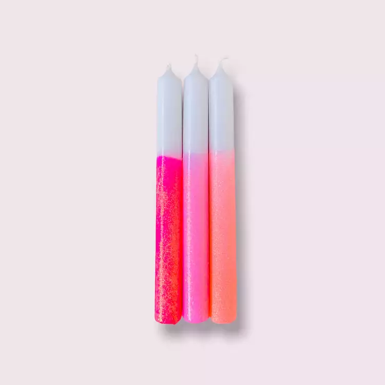 This boxed set of x 3 taper candles will satisfy all your retro day glow dreams. Now with added glitter sparkle for maximum glam. A fun way to brighten up your table setting and a most unique, fun gift item.Â
