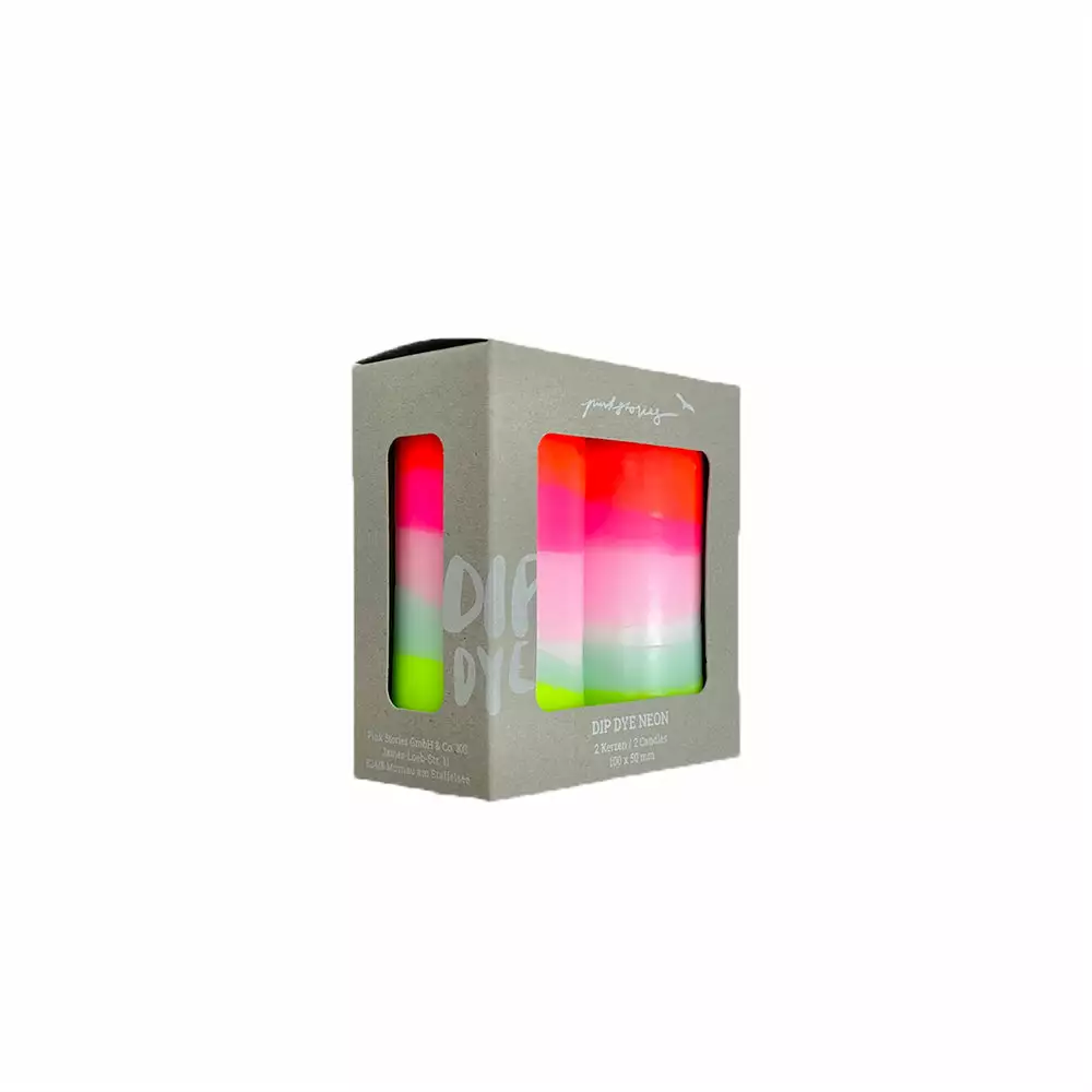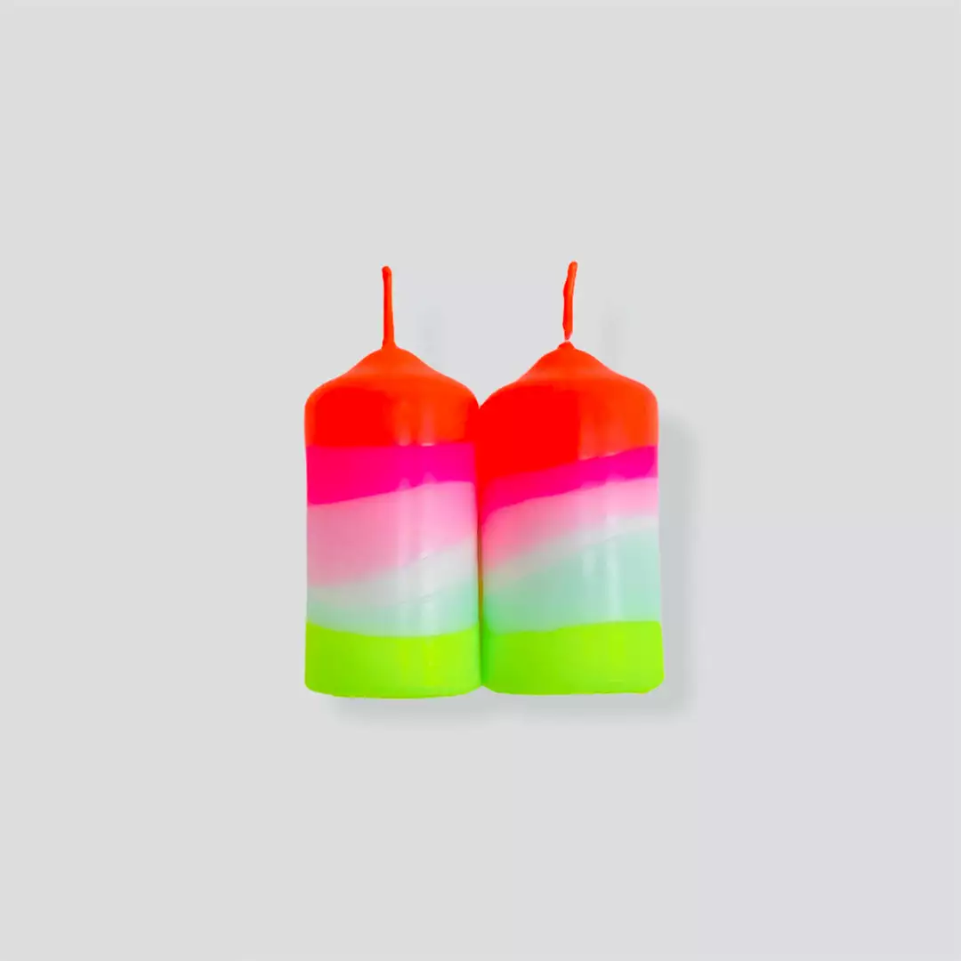 This boxed set of x2 neon pillar candles will satisfy all your retro day glow dreams. A fun way to brighten up your table setting and a most unique, fun gift item.Â