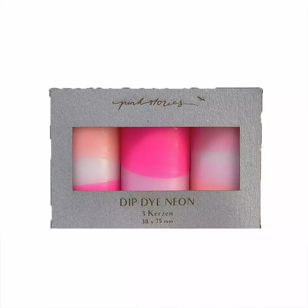 This boxed set of x 3 pillar candles will satisfy all your retro day glow dreams. A fun way to brighten up your table setting and a most unique, fun gift item.Â