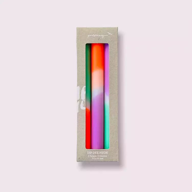 This boxed set of x 3 taper candles will satisfy all your retro day glow dreams. A fun way to brighten up your table setting and a most unique, fun gift item. Lime, purple, and orange. Â