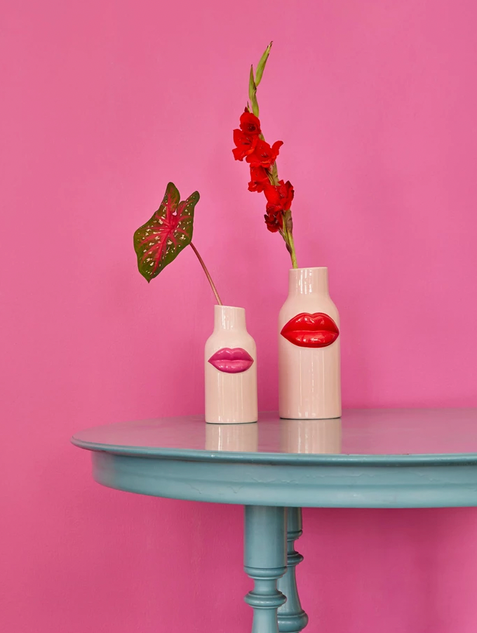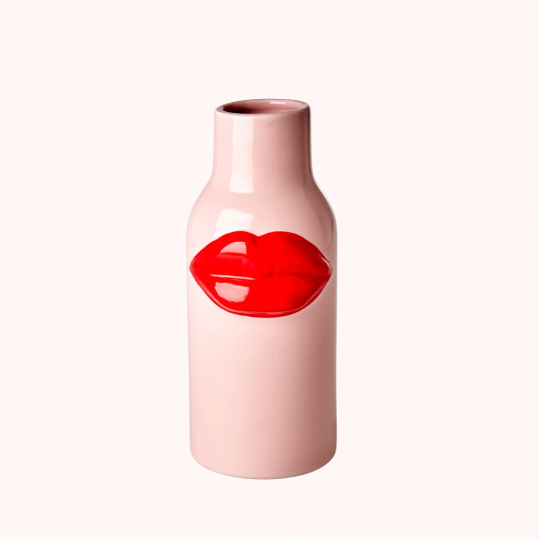 Say it with a kiss…this fun pink vase with it’s cheeky RED lipstick kiss will delight any room. Cheeky fun with a joyful pop of colour. Also available in a smaller size with PINK lips.