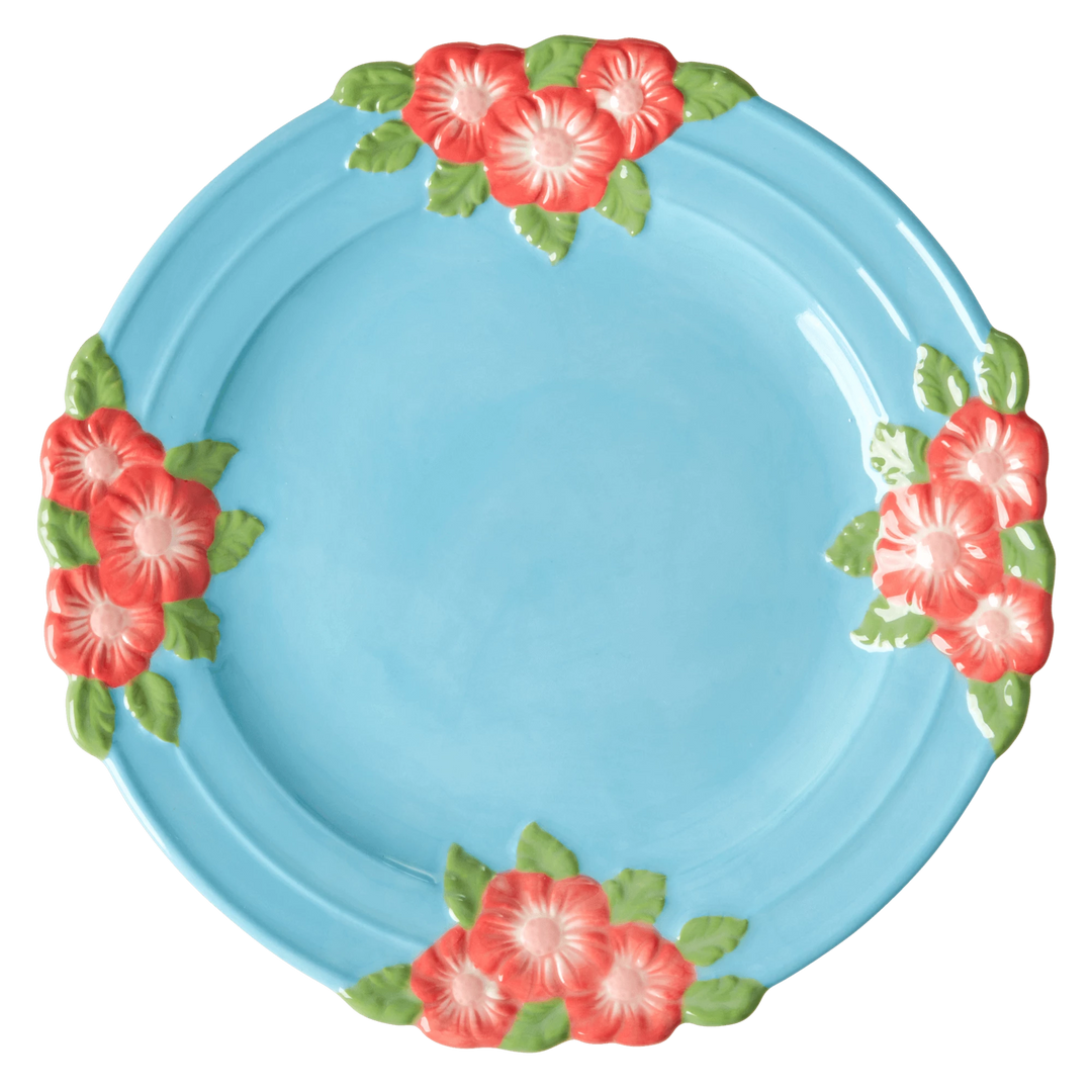 Ceramic Floral Dinner Plate Blue with Raspberry Flowers  Â