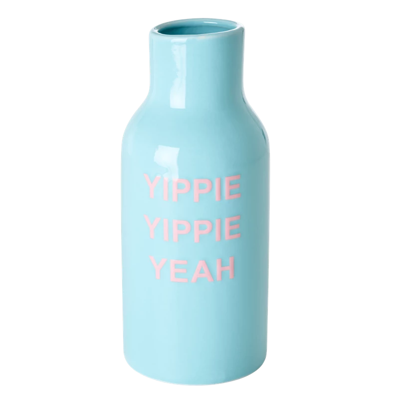 Ceramic vase in a beautiful blue with the text: YIPPIE YIPPIE YEAH will make sure to make your flowers happier and get each day started with a smile.