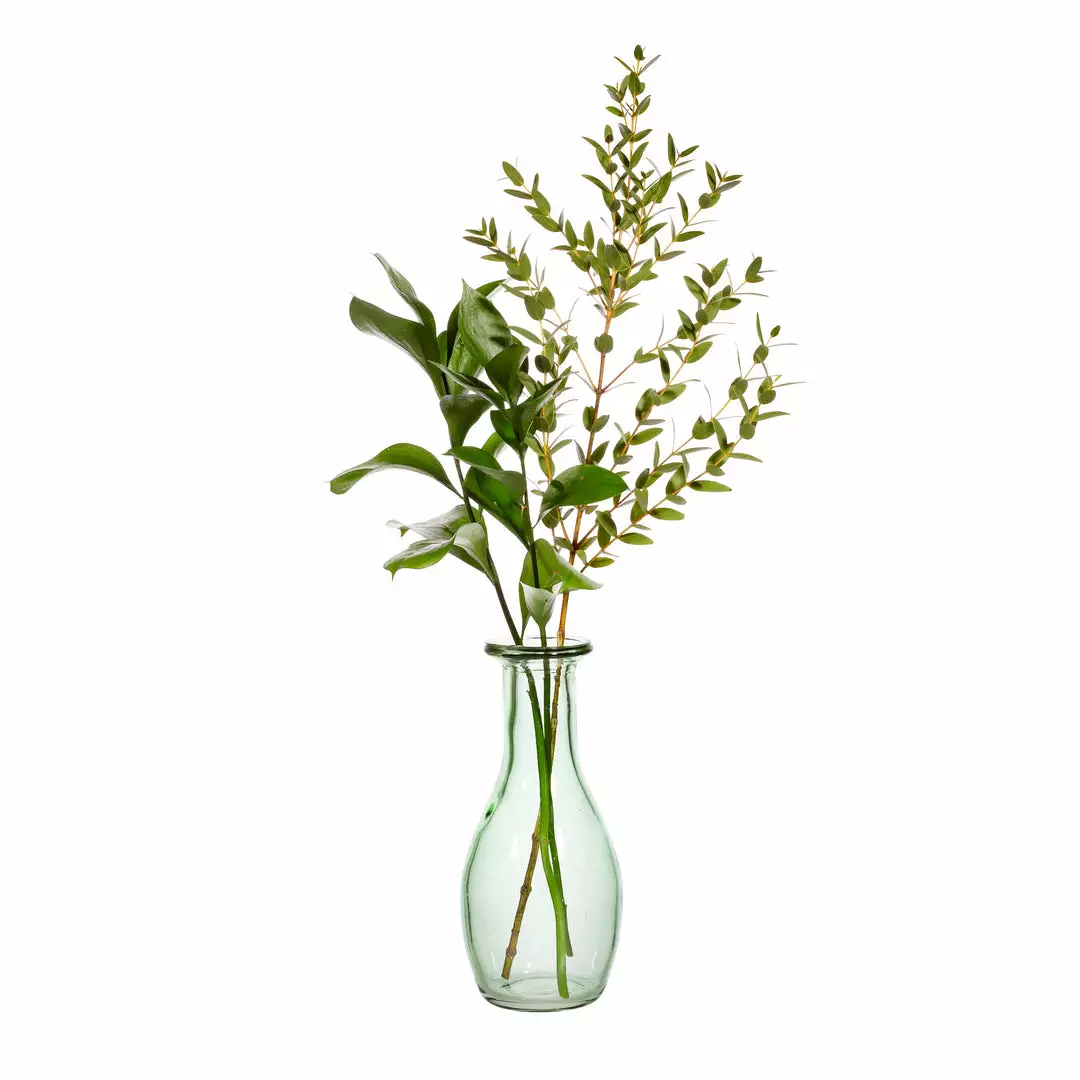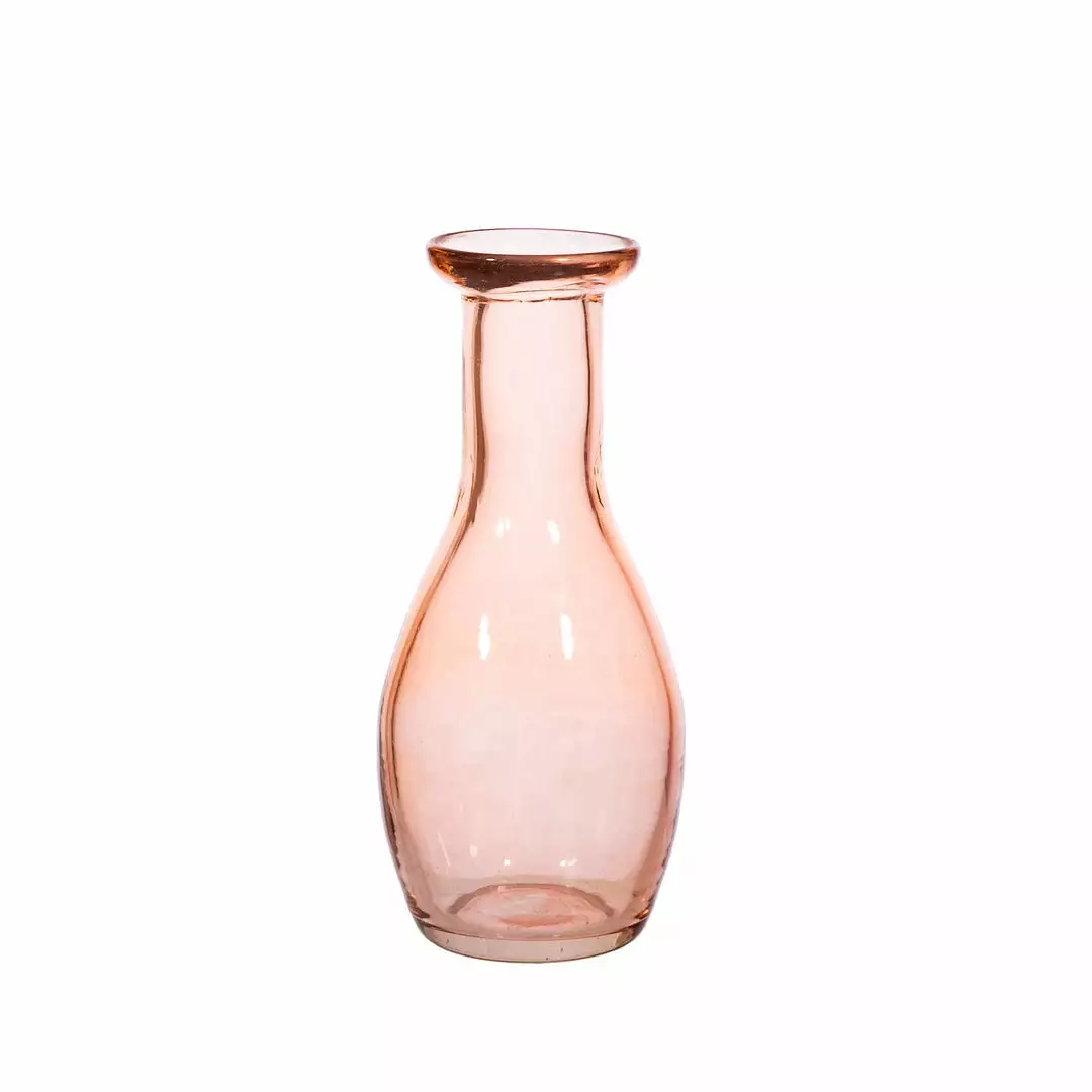 Deepa vase perfect for a home which love pops of colour. Made from recycled glass with a pastel green glaze. Each one from the set of three has a unique shape with a rounded base and narrow neck. Perfect for displaying mini bunches of blooms. We stock these vases in pink and green.Â