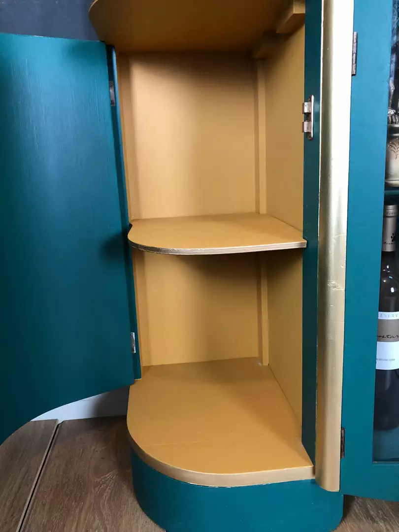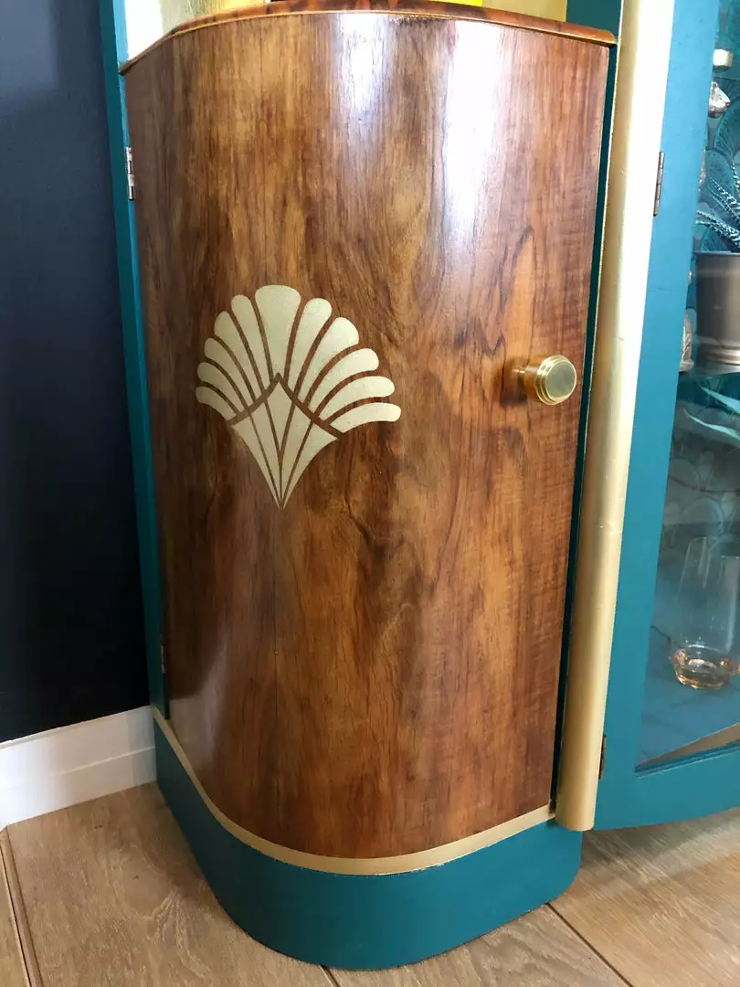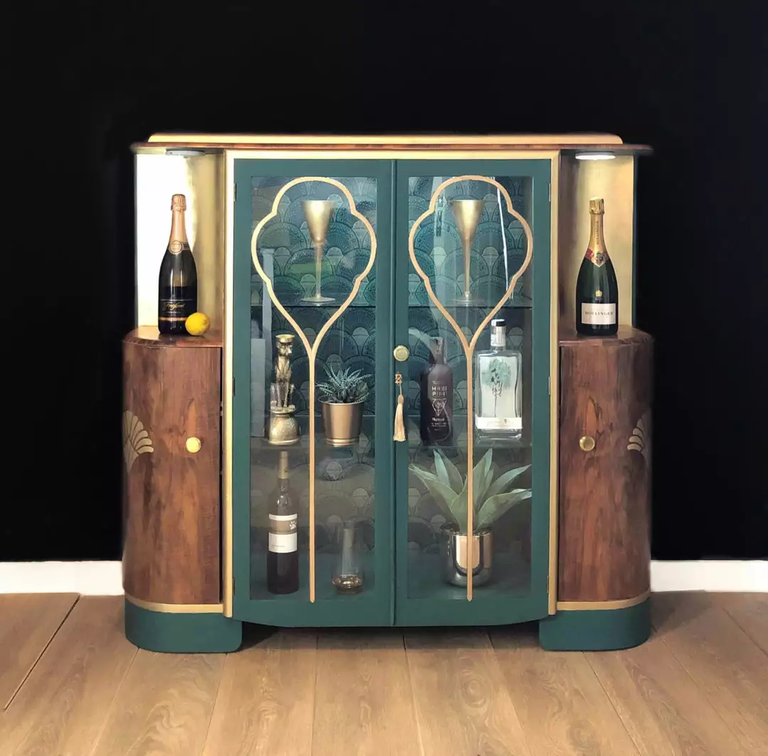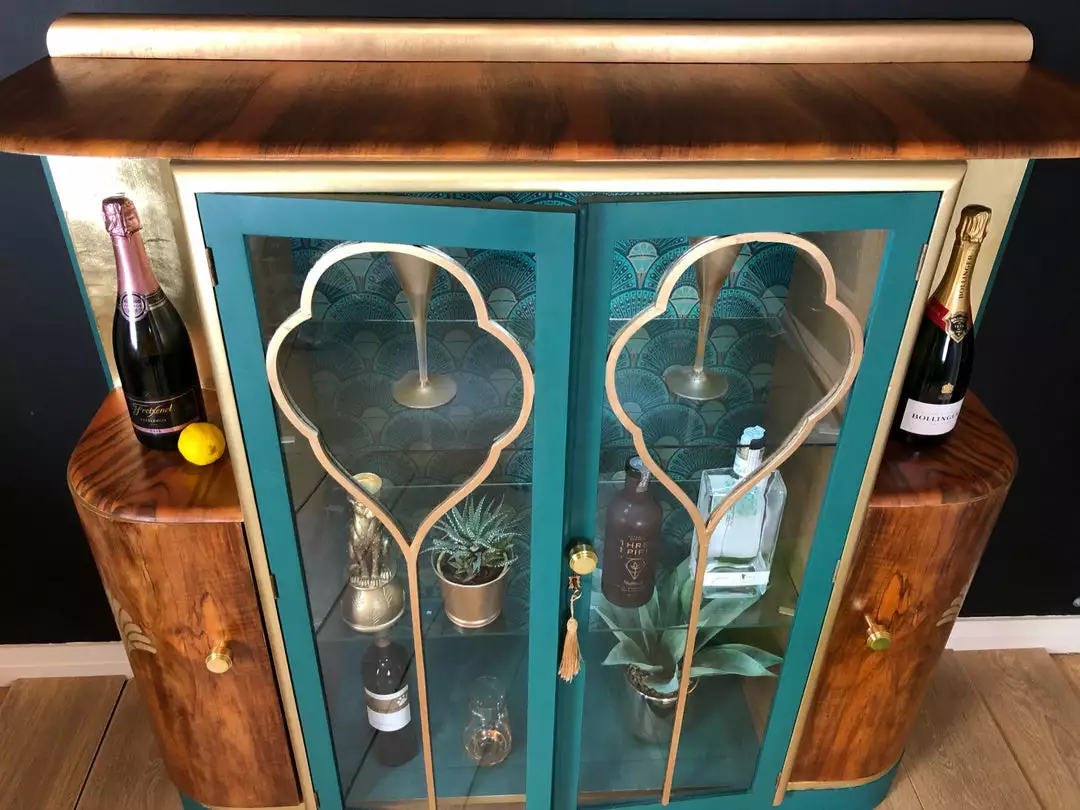 This unusual Walnut Art Deco cabinet takes us back to the decadent glamour of 1920s and 1930s eras. It has been lovingly and sympathetically restored with a unique contemporary design details and is now ready to be adored in a new home. The glorious cabinet features a central glass display section, with organically curved wooden sections at each end. There is lock and key for the glass display, and interior rechargeable LED lighting, which can be set to stay on or come on when opened. It sits elegantly on an Art Deco curved wooden base. The piece has been finished in high quality furniture mineral paint, in bespoke mixed colour, giving a deep teal blue/green richness. The stunning natural walnut grain has been sanded and enhanced with several coats of superior finishing oil. The interior has been painted with a mustard shade of mineral paint, to complement the deep teal, and waxed with specialist furniture salve. It smells divine! It has been styled to complement its Art Deco features, with sophisticated touches of design print and gold leafing, gilding and stencilling. All the work is meticulously created by hand. The main glass doors of the centre display case have a golden curved Deco motif design against the deep teal paint. Inside, shows a stunning designer pattern, “Deco Martini” from a “Divine Savages” collection. There are two glass shelves and the sides panels have been refurbished with a complementing gold paper. The luxurious curved end sections boast not only the deep grain beauty of original wood, but also bespoke stencilling Art Deco fan designs in gold, complementing the “Deco Martini” designer paper in the centre cabinet. The curved upper sections have a walnut shelf and gold leafing to add a luxurious glow to the piece. Underneath, each cupboard has a small shelf which can easily be taken