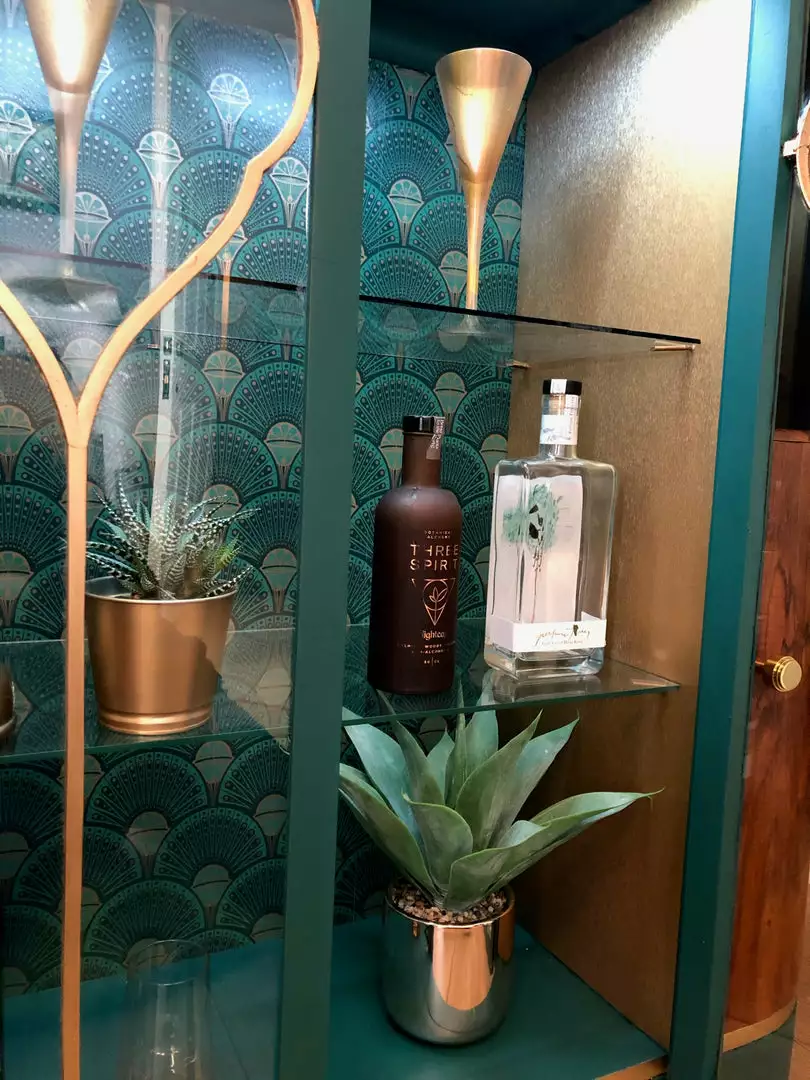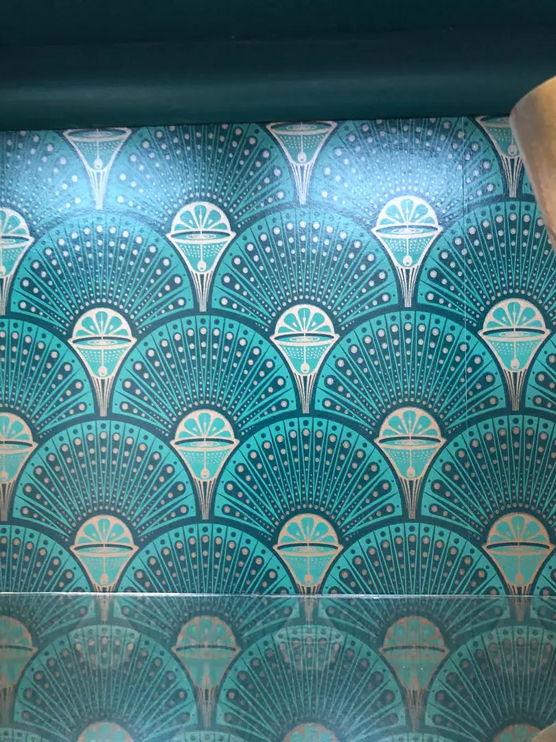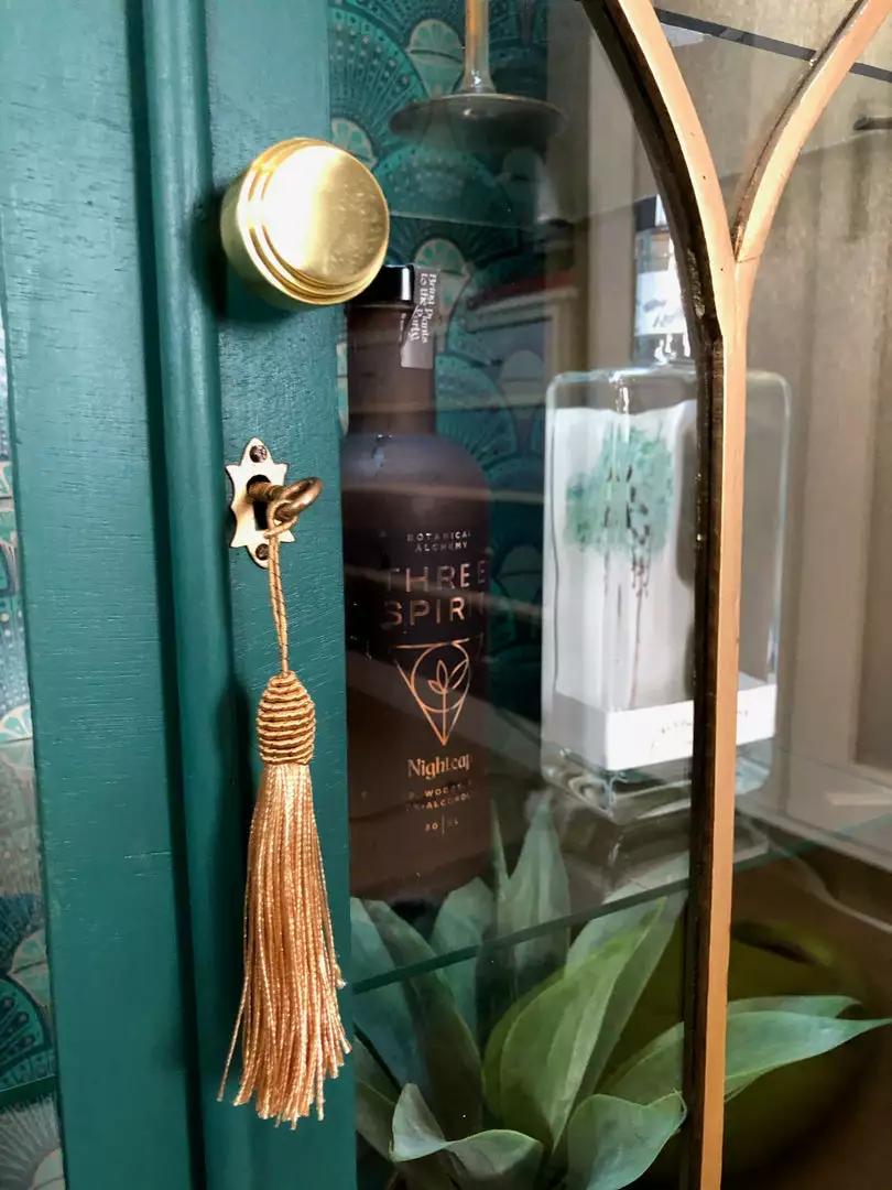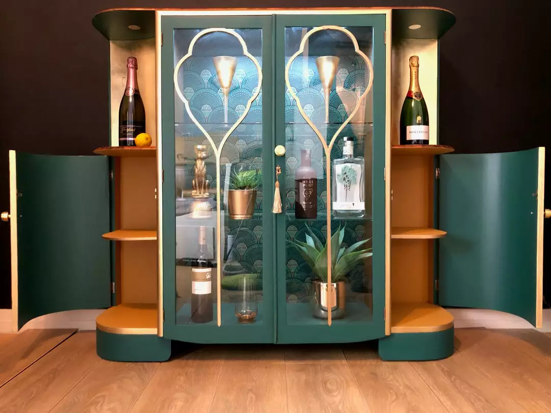 This unusual Walnut Art Deco cabinet takes us back to the decadent glamour of 1920s and 1930s eras. It has been lovingly and sympathetically restored with a unique contemporary design details and is now ready to be adored in a new home. The glorious cabinet features a central glass display section, with organically curved wooden sections at each end. There is lock and key for the glass display, and interior rechargeable LED lighting, which can be set to stay on or come on when opened. It sits elegantly on an Art Deco curved wooden base. The piece has been finished in high quality furniture mineral paint, in bespoke mixed colour, giving a deep teal blue/green richness. The stunning natural walnut grain has been sanded and enhanced with several coats of superior finishing oil. The interior has been painted with a mustard shade of mineral paint, to complement the deep teal, and waxed with specialist furniture salve. It smells divine! It has been styled to complement its Art Deco features, with sophisticated touches of design print and gold leafing, gilding and stencilling. All the work is meticulously created by hand. The main glass doors of the centre display case have a golden curved Deco motif design against the deep teal paint. Inside, shows a stunning designer pattern, “Deco Martini” from a “Divine Savages” collection. There are two glass shelves and the sides panels have been refurbished with a complementing gold paper. The luxurious curved end sections boast not only the deep grain beauty of original wood, but also bespoke stencilling Art Deco fan designs in gold, complementing the “Deco Martini” designer paper in the centre cabinet. The curved upper sections have a walnut shelf and gold leafing to add a luxurious glow to the piece. Underneath, each cupboard has a small shelf which can easily be taken