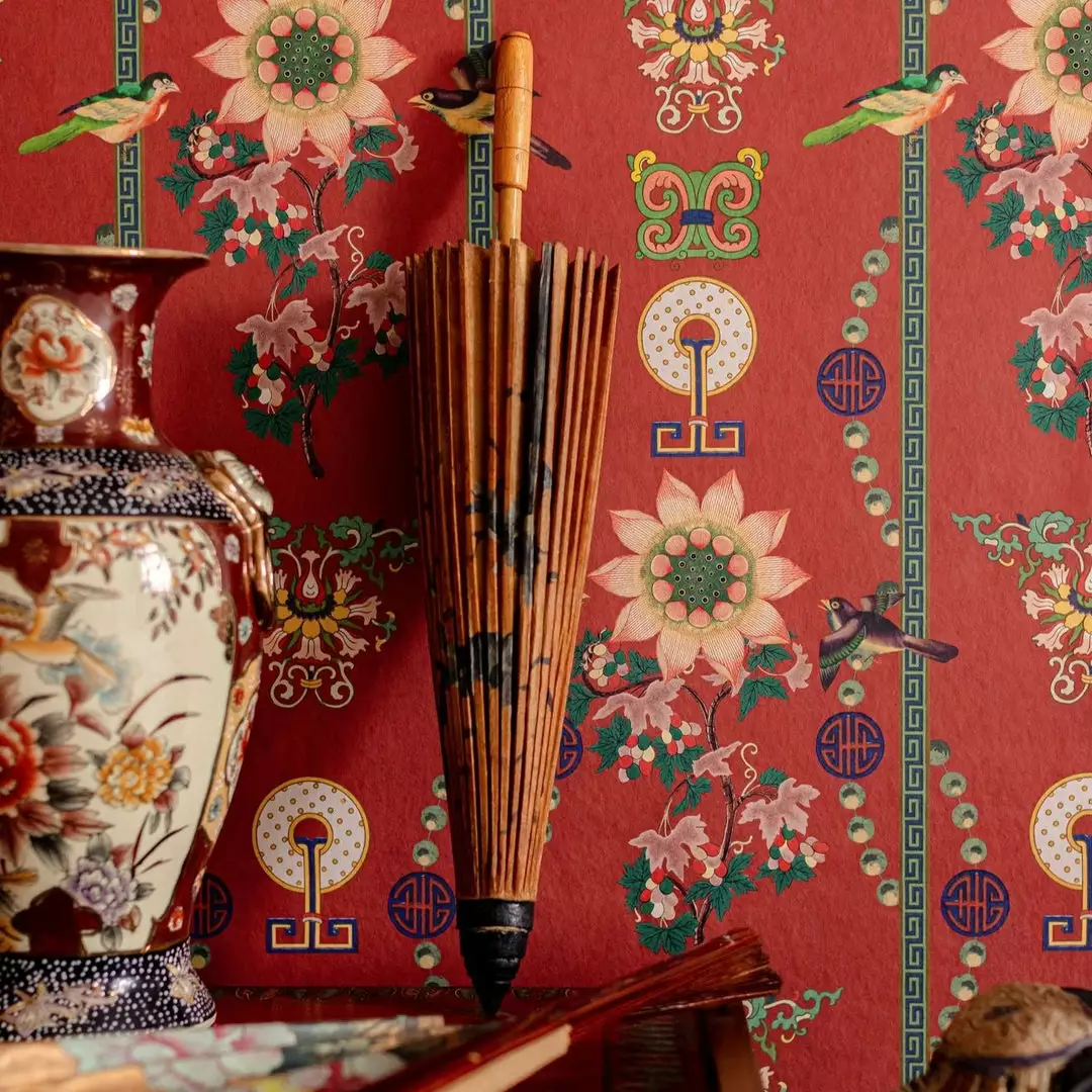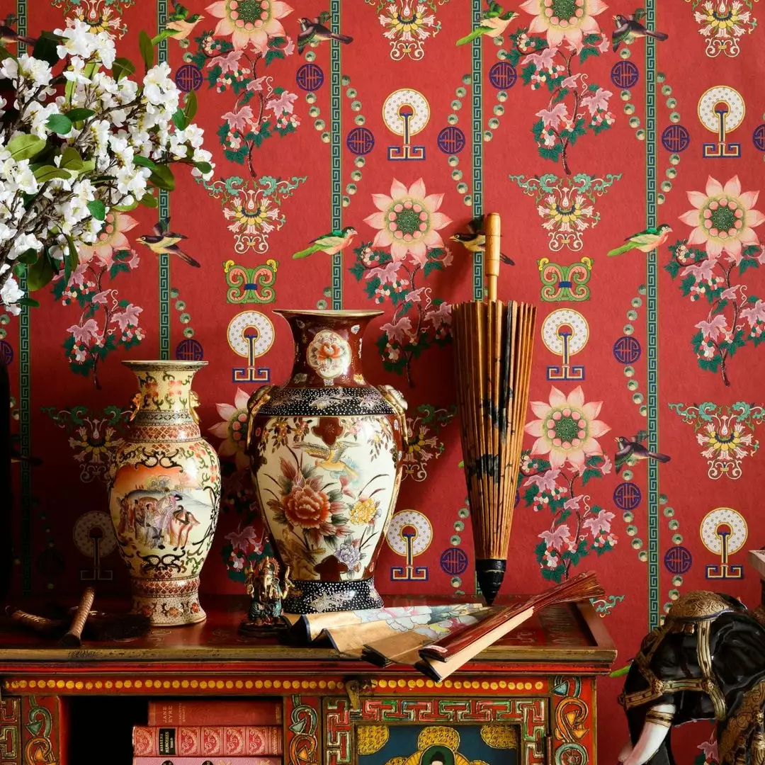 Step into a lavish, rich print inspired by a famous Chinese garden. The Lin Yuan wallpaper by Mind The Gap features intricate and elegant motifs including, florals, birds and plants on a zingy green background. The Oriental motifs symbolise luck, wealth and immortality. Also available in Chinese Red.Â