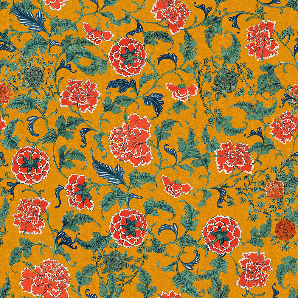 A powerful wallpaper from Mind The Gap featuring soft, intertwining florals on a vibrant ochre background creating an impactful space. Use to enhance any room whether a maximalist statement or feature area.Â
