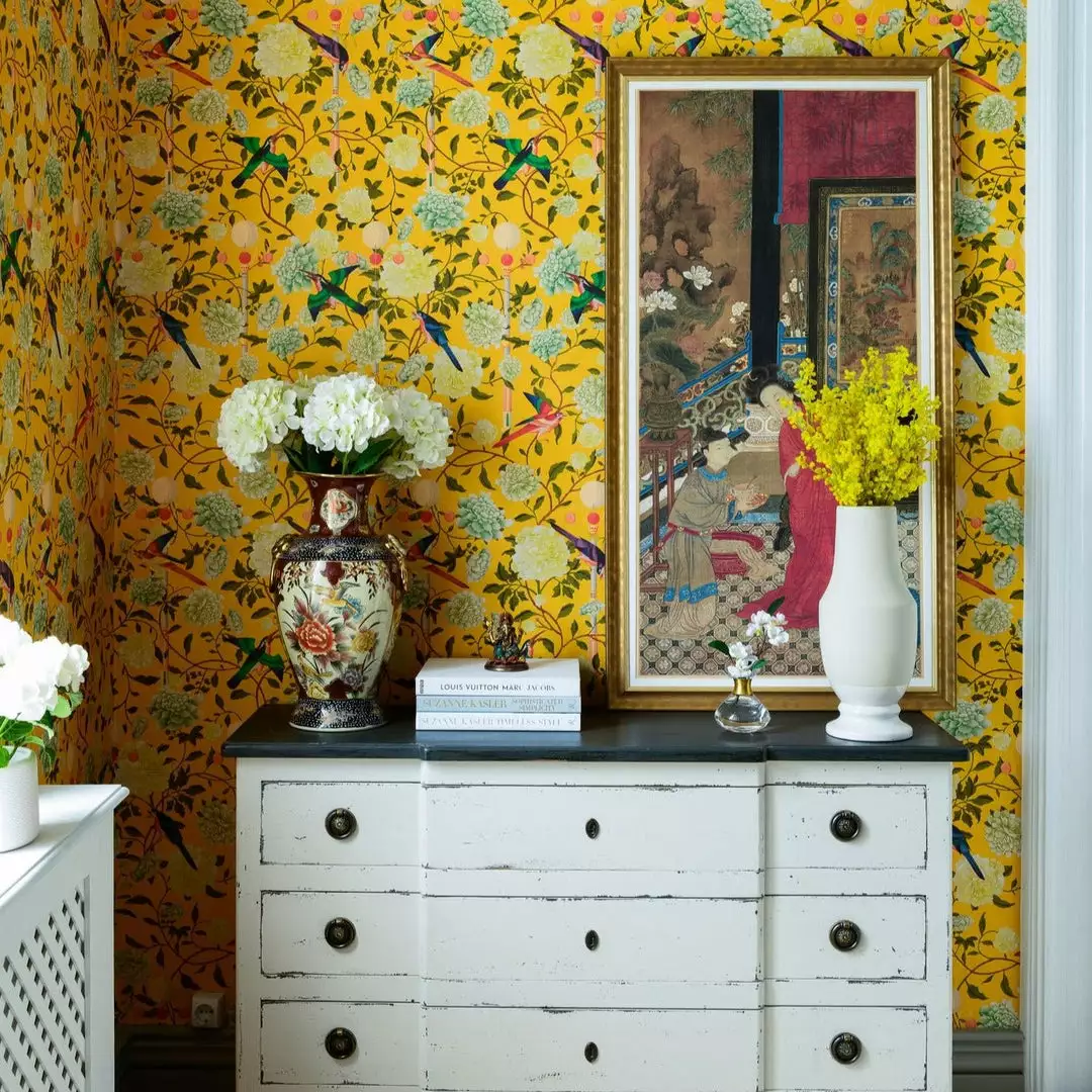 Immerse yourself in a refresh of an oriental design in The Garden Of Immortality wallpaper from Mind The Gap. Florals, vines and birds sit harmoniously on a mustard yellow background which creates a statement perfect for any room. Also available in Mustard Yellow.Â