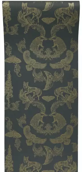 A beautiful design by Laura Garner, hand drawn illustrations featuring foxes, birds and nesting badgers. Forest foliage and a shimmering golden moon are set against a light cream background. A modern twist on an English classic, a damask style with a playful edge.Â