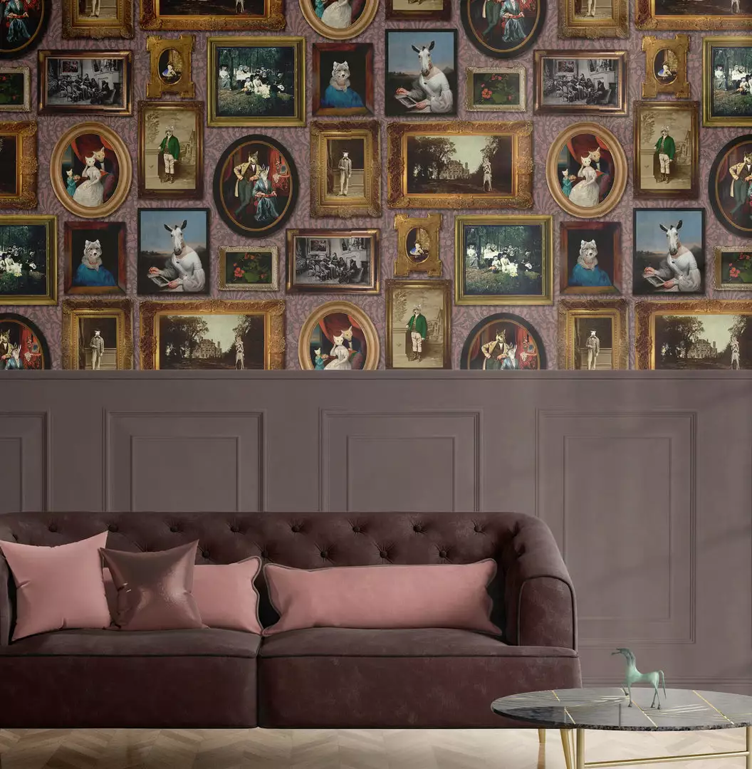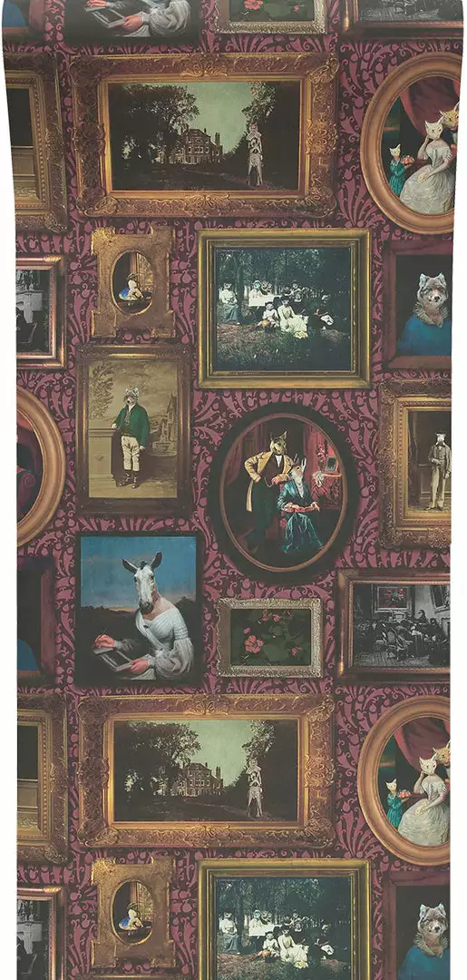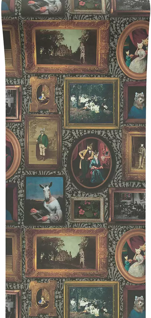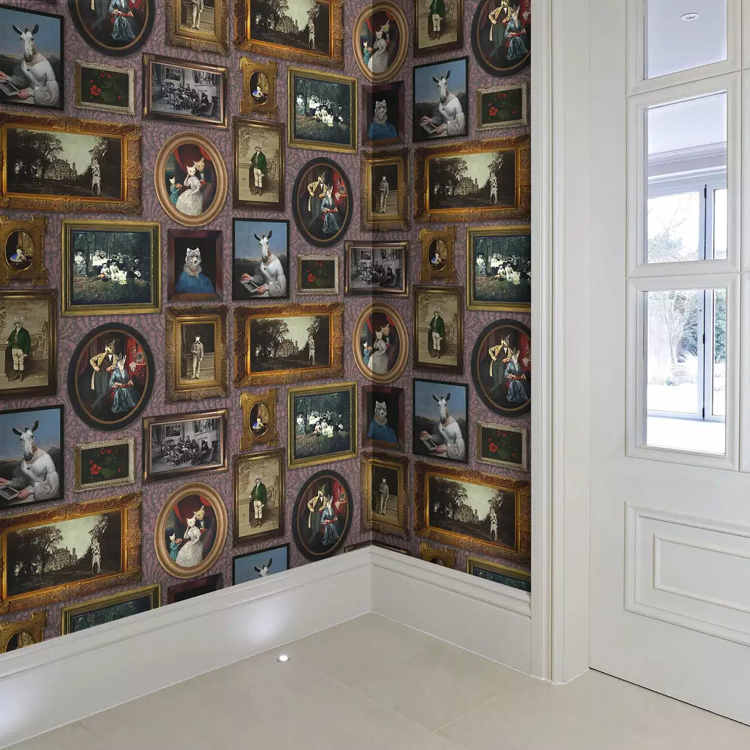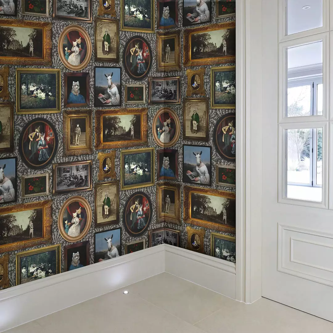 The Art Gallery wallpaper contains an original 19th century background wallpaper combined with original works of art by Charlotte in a collection of decorative frames, all gathered in the most eclectic family portraits walls. A wonderful and whimsical way of showcasing paintings by this gifted artist.  Â