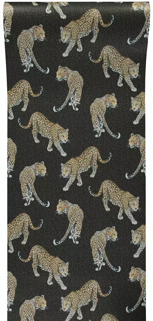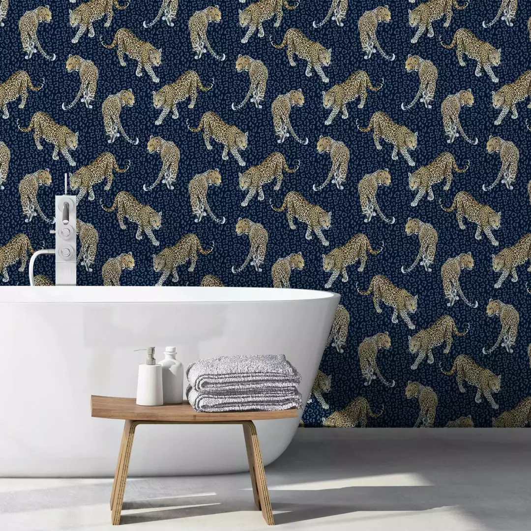 A striking wallpaper design from Abi Bartlett of hand painted leopards prowling across a tonal skin background. Indulgent, glamourous and dramatic. Â