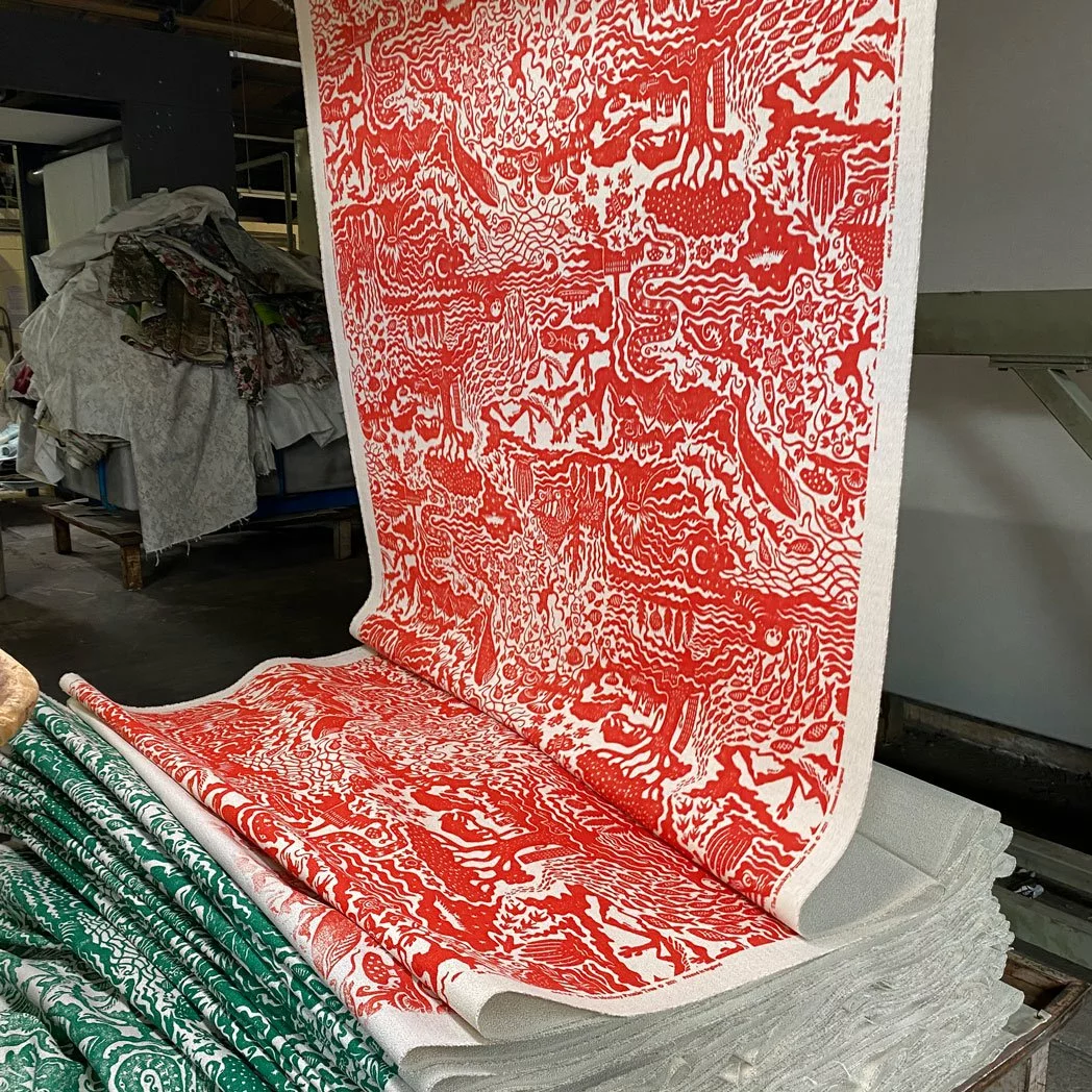Alexis sketched the design, before hand-carving into lino block which was printed by hand. This pattern was then screen-printed onto bespoke cotton-linen fabric a heritage mill in Cumbria.Â