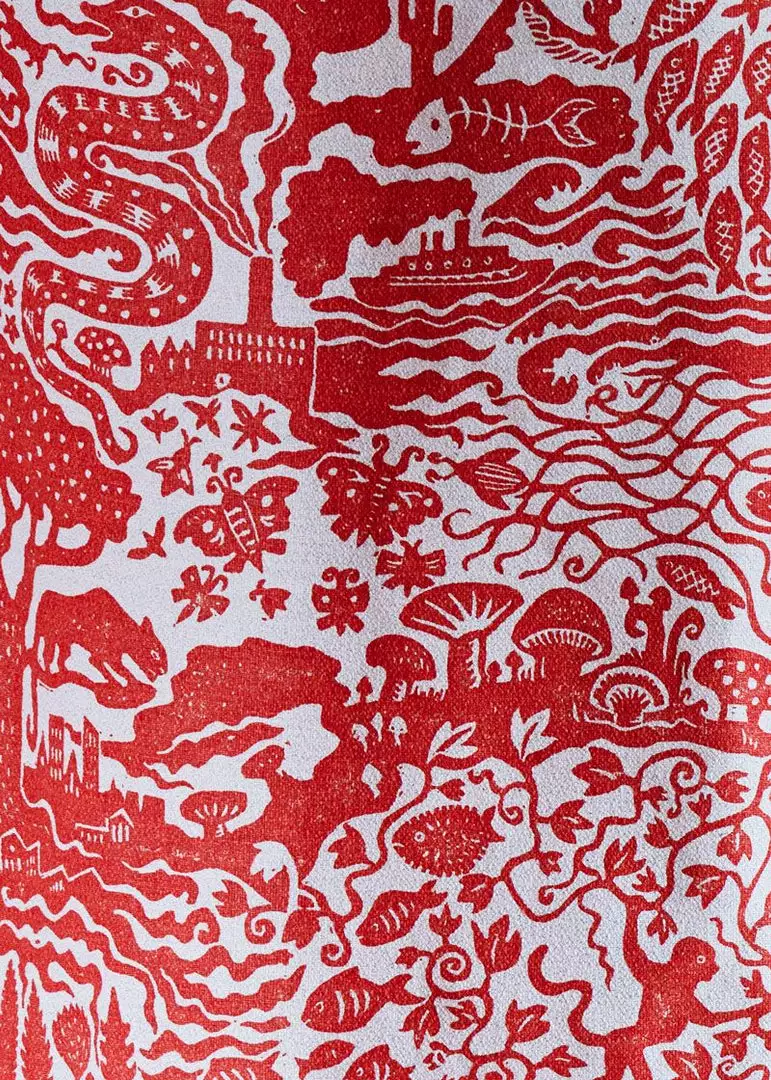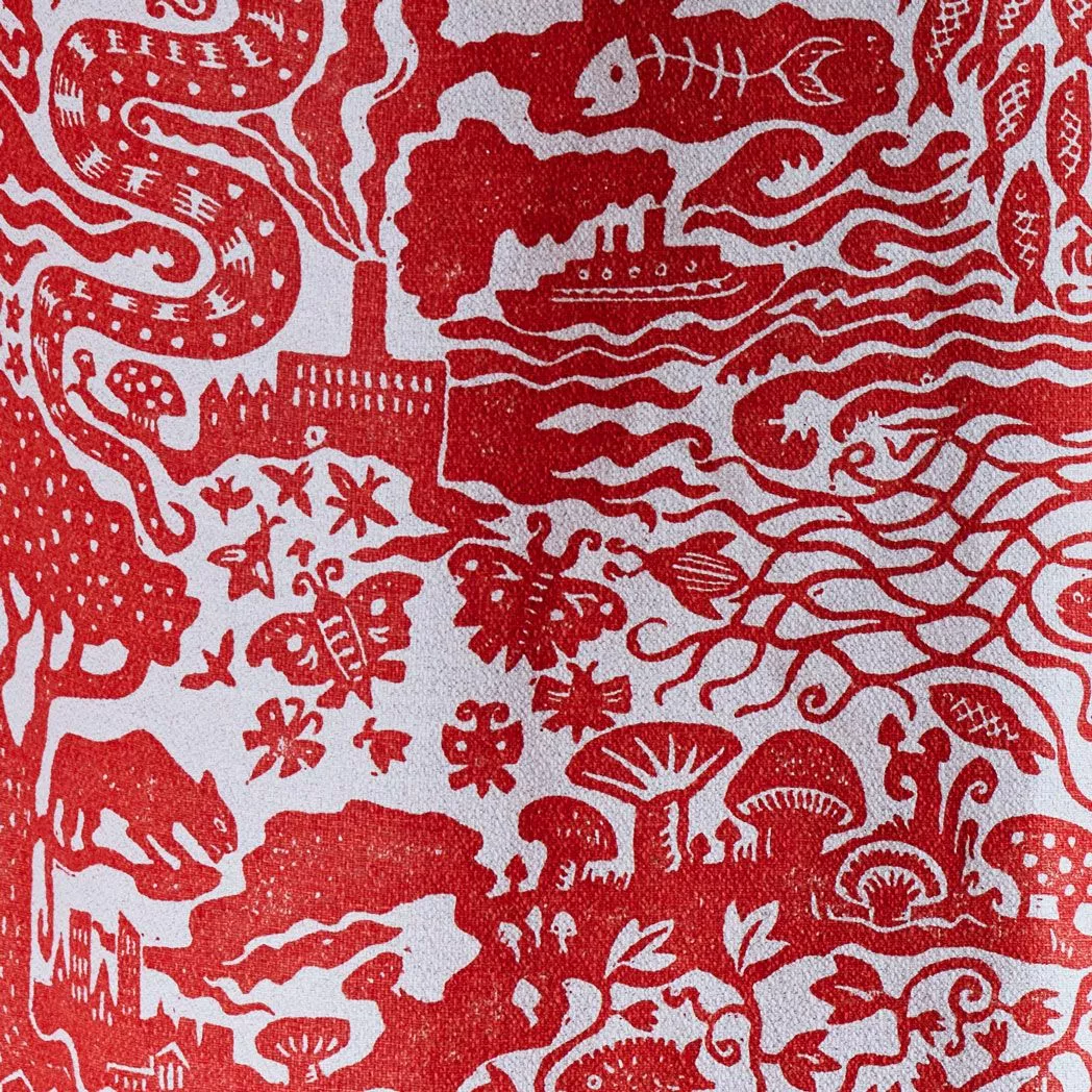 Alexis sketched the design, before hand-carving into lino block which was printed by hand. This pattern was then screen-printed onto bespoke cotton-linen fabric a heritage mill in Cumbria.Â