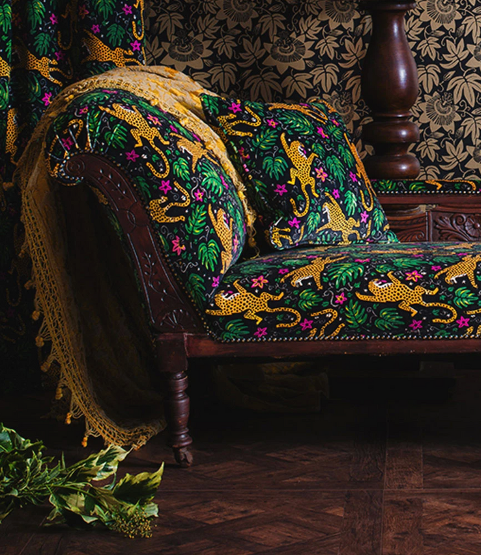 The Monkey Puzzle Tree collaborated with Alexis Snell to create ‘How the Leopard Got His Spots’ velvet fabric. Featured in Elle Decoration, Homes and Gardens and Real Homes Magazine. This maximalist jungle velvet can be used for upholstery, curtains or blinds.Â