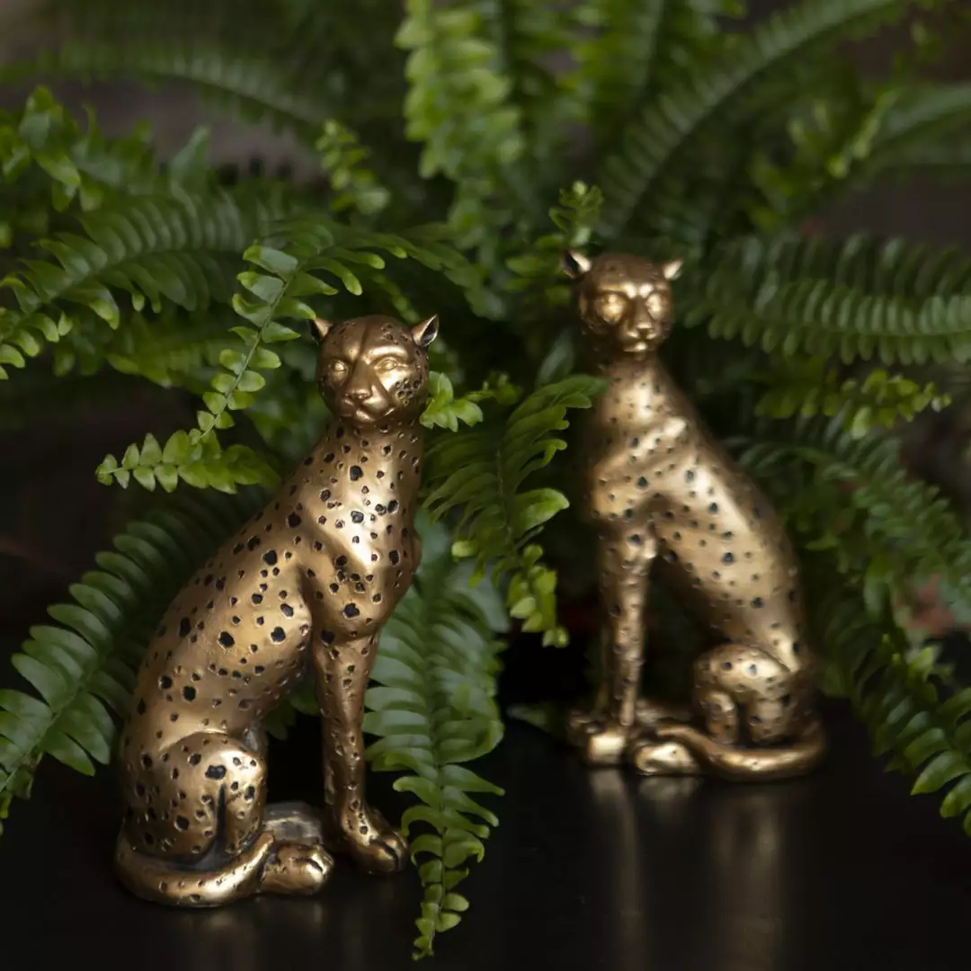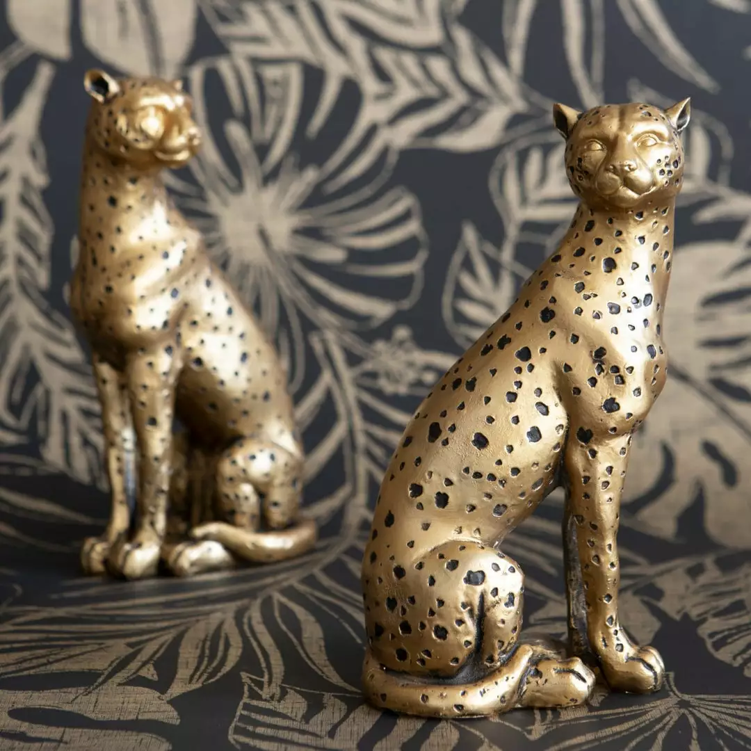 Add opulence to your decor with these Art Deco inspired Cheetah ornaments. Sold as a pair, hand finished in a vintage distressed gold.Â